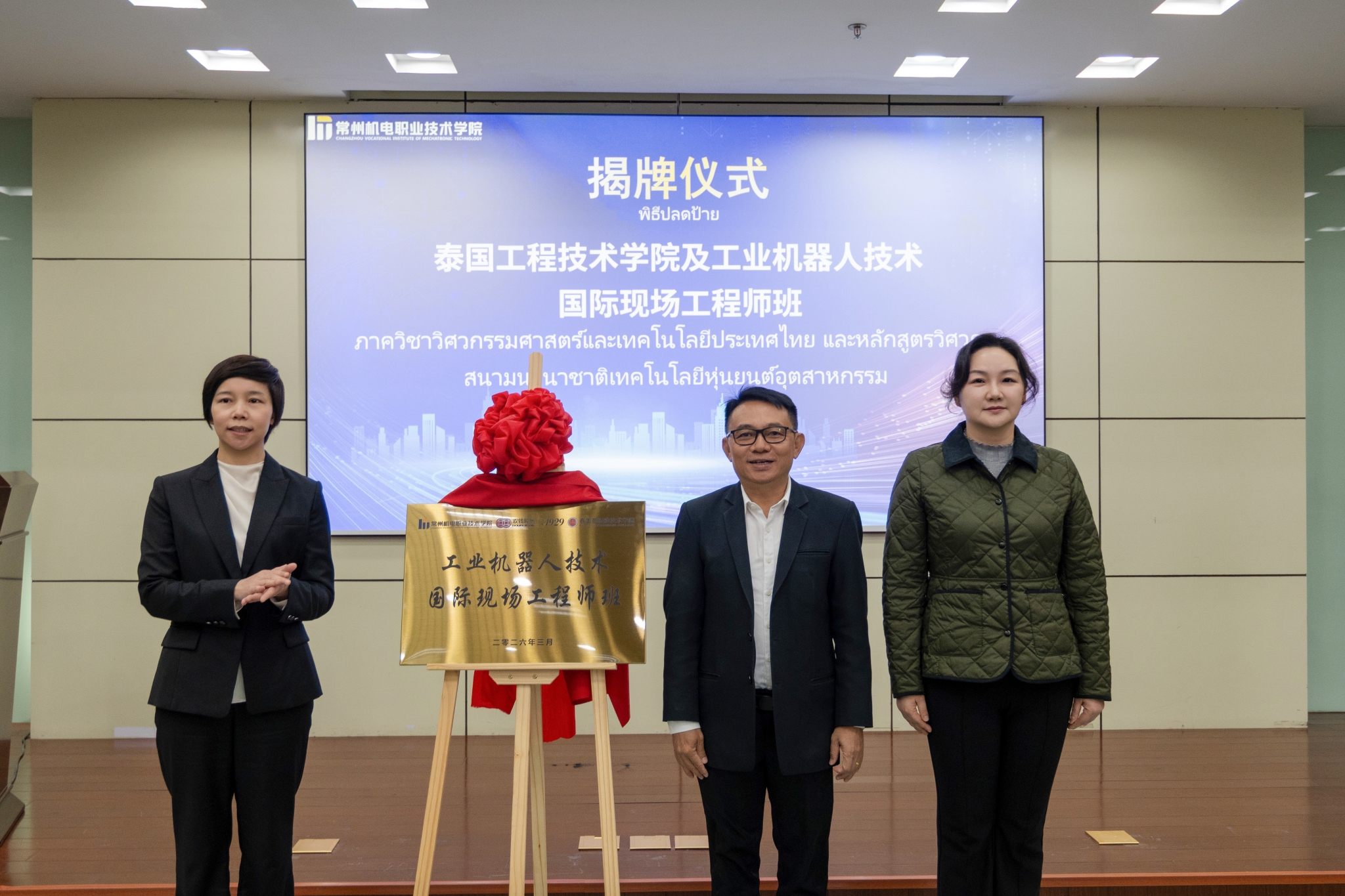 3月9日,我校与泰国芭提雅技术学院、双钱轮胎集团三方共建的“工业机器人技术海外工程技术学院”揭牌暨“国际现场工程师班”开班仪式在我校举行。泰国芭提雅技术学院校长西拉梅一行,双钱轮胎集团党委组织部部长、人力资源部总监吴培培,我校校长刘畅、副校长周庆元出席,泰国师生代表团及我校国际教育学院、电气工程学院相关负责人参加活动。