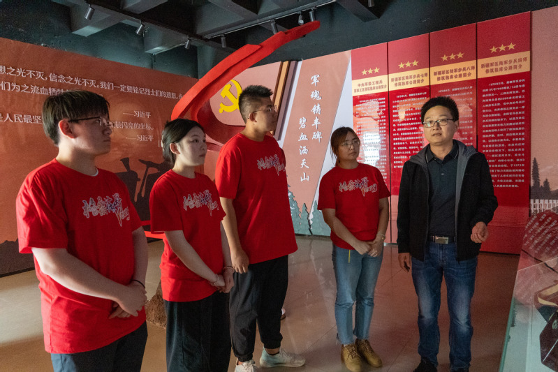 在革命烈士纪念碑前,同学们怀着崇敬的心情缅怀先烈。在参观烈士事迹纪念馆的过程中,同学们遇到了烈士陵园守护人、全国模范退役军人陈俊贵,认真聆听了他和战友们修建天山独库公路的光辉事迹。乔尔玛烈士陵园正是为了纪念在修筑天山独库公路牺牲并安葬在这里的168名解放军战士而建的国家革命烈士陵园。一张张珍贵的照片,一件件感人的事迹,震撼了在场的每一个人。