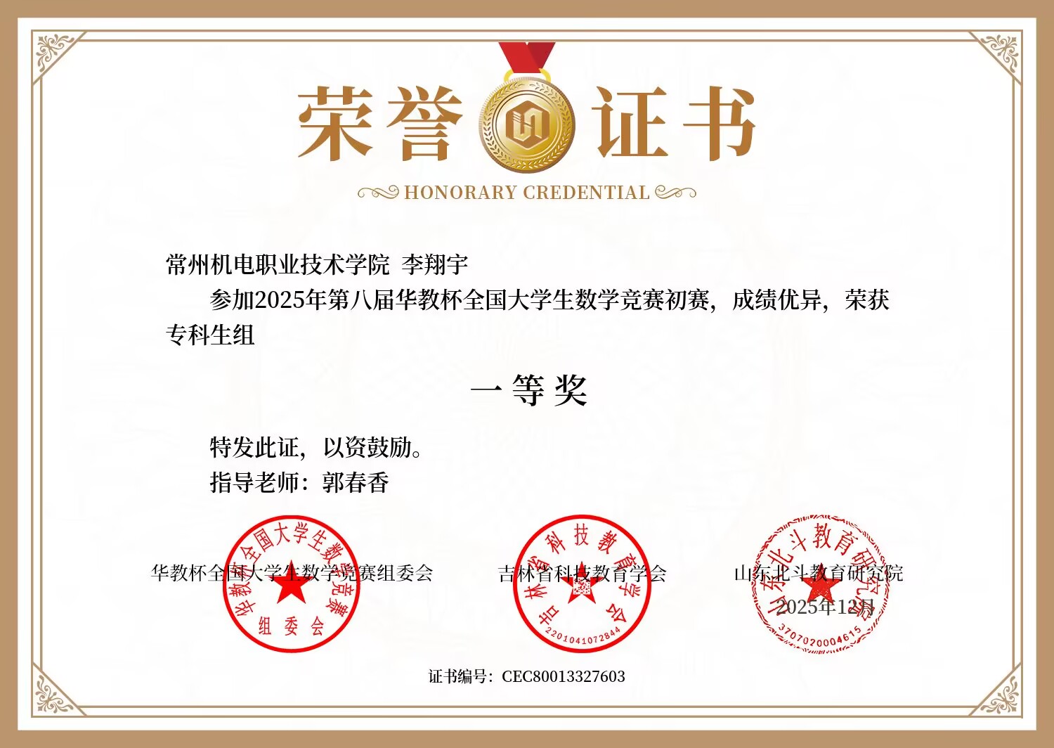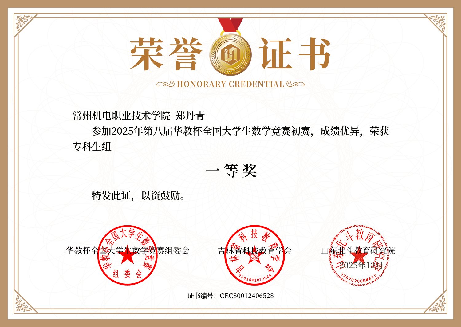 12月15日,2025年第八届华教杯全国大学生数学竞赛初赛成绩揭晓。我校共16名同学参赛,获得了一等奖2项、二等奖2项、三等奖10项。