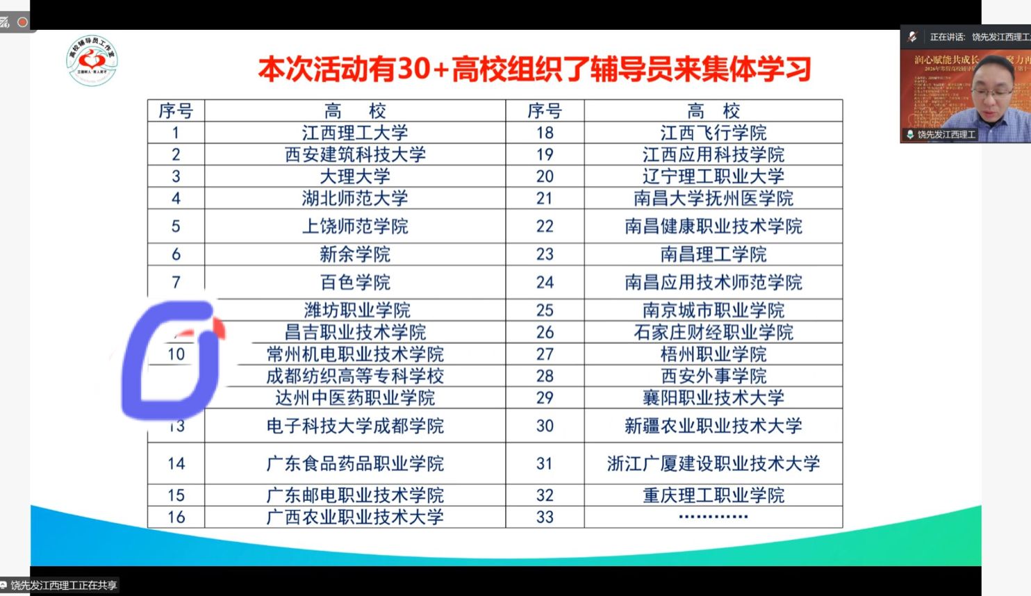 为全面落实立德树人根本任务,切实提升高校辅导员的理论素养与科研实践能力,1月24日上午,机械工程学院“琢磨”劳动教育辅导员工作室联合全国35个辅导员工作室共同承办的“高校辅导员素质能力提升营(第十一季)”直播活动圆满收官。学工处组织全体辅导员参与本次学习。