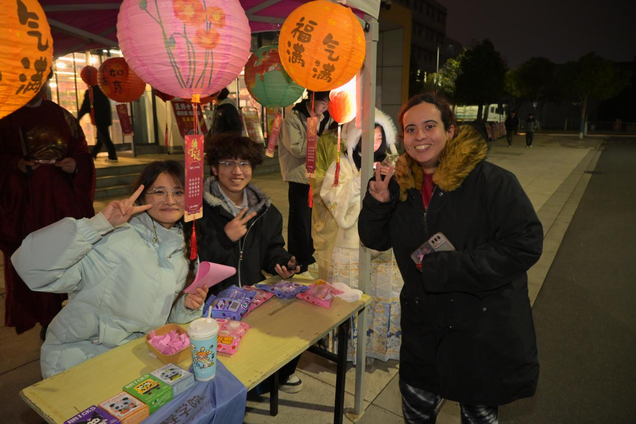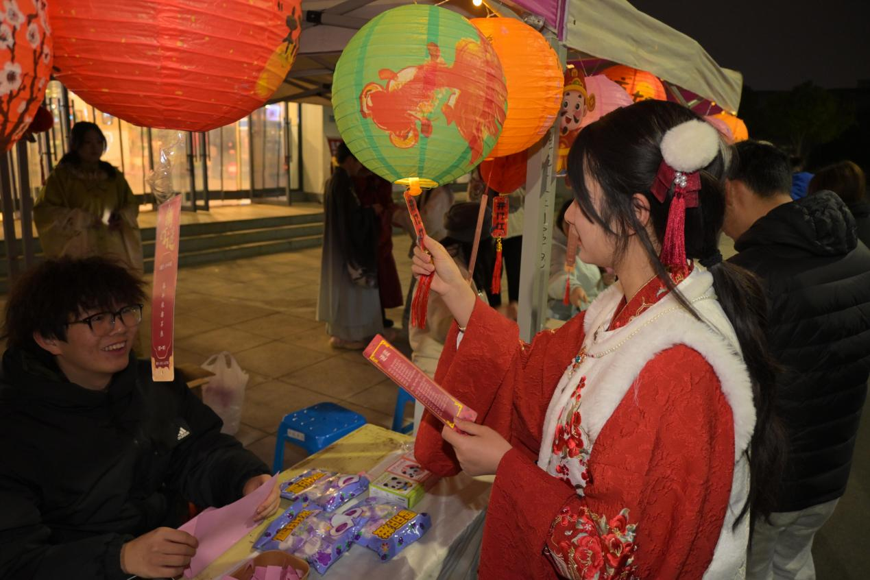 学生自主设计制作的花灯整齐摆放,猜灯谜环节兼顾民俗与专业,除传统谜题外,还加入电气知识、“双碳”能源等相关题目。汉服社同学的展演和笛音演奏,为活动增添了传统文化气息,与科技感花灯相互映衬。