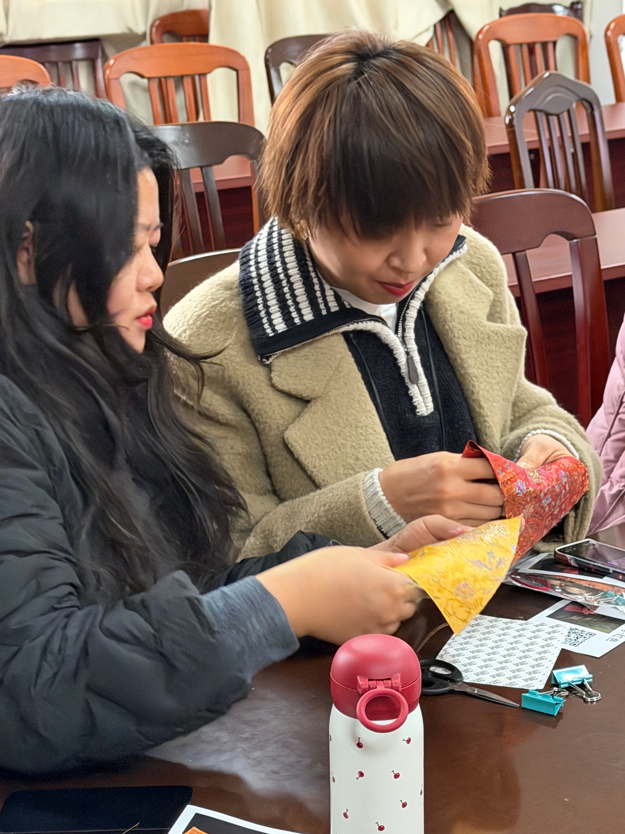 活动现场,宋锦布料、手工工具整齐摆放。在指导老师的讲解与示范下,女教职工们了解宋锦的历史文化渊源,初步掌握了宋锦胸针、小马摆件的制作技巧。制作过程中,老师们各展巧思,将普通锦布打造成或典雅大方、或俏皮可爱的精致饰品;挑战小马摆件制作时,大家发挥想象力,巧选锦缎花纹裁剪拼接,完成一件件宋锦小马。
