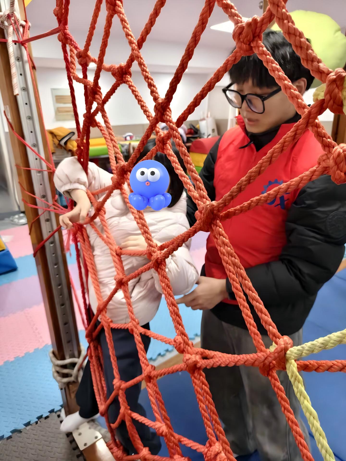 活动现场,身着红马甲的志愿者们分组进入各康复课堂,以“一对一”结对陪护的形式,全流程配合老师开展教学辅助。在精细课堂,志愿者们手把手引导孩子完成握笔、串珠等训练,耐心矫正动作细节;音乐课堂上,志愿者们跟随旋律带动孩子一起律动,用轻松节奏消解孩子的紧张感;绘本课堂里,志愿者们用温柔语调讲述故事,引导孩子表达感受,搭建语言沟通桥梁;感统训练课堂中,志愿者们全程做好安全防护与动作辅助,配合老师完成感统调节训练。志愿者们还深度参与语言、认知、社交等核心康复课堂,配合老师完成指令引导、情景模拟、社交互动等环节,用十足的耐心与真诚的鼓励,守护孩子们的每一次成长尝试。