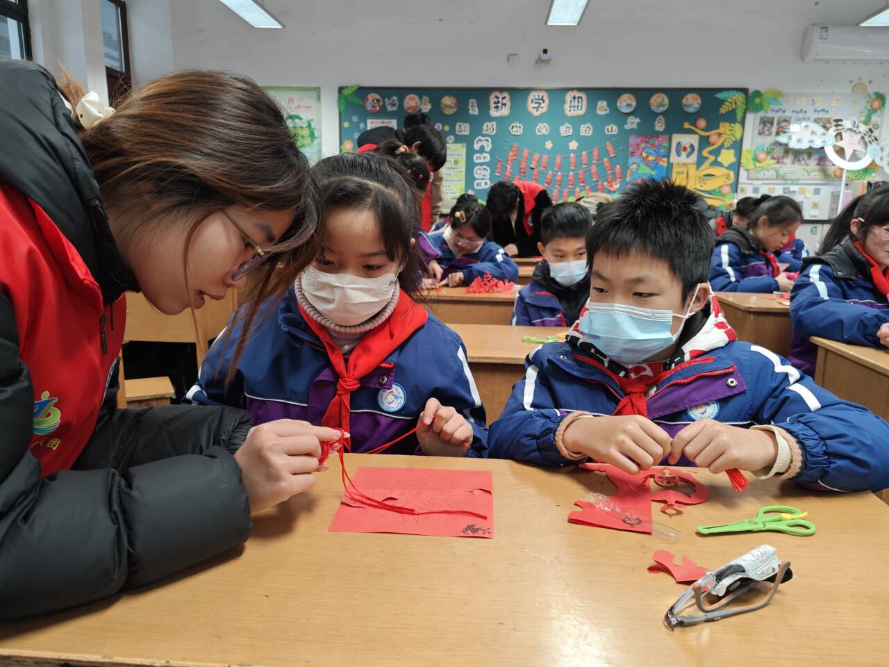 志愿服务团的成员们与孩子们一同开展中国结编织和剪纸趣味体验活动。孩子们在志愿者的耐心指导、手把手教学下,亲手制作出一个个寓意吉祥的中国结和一幅幅充满童趣的剪纸作品。
