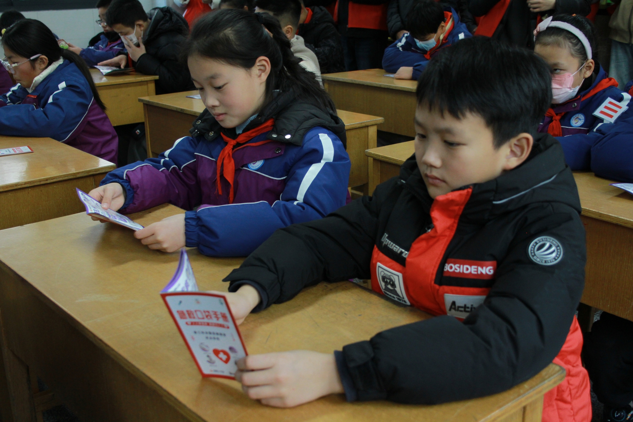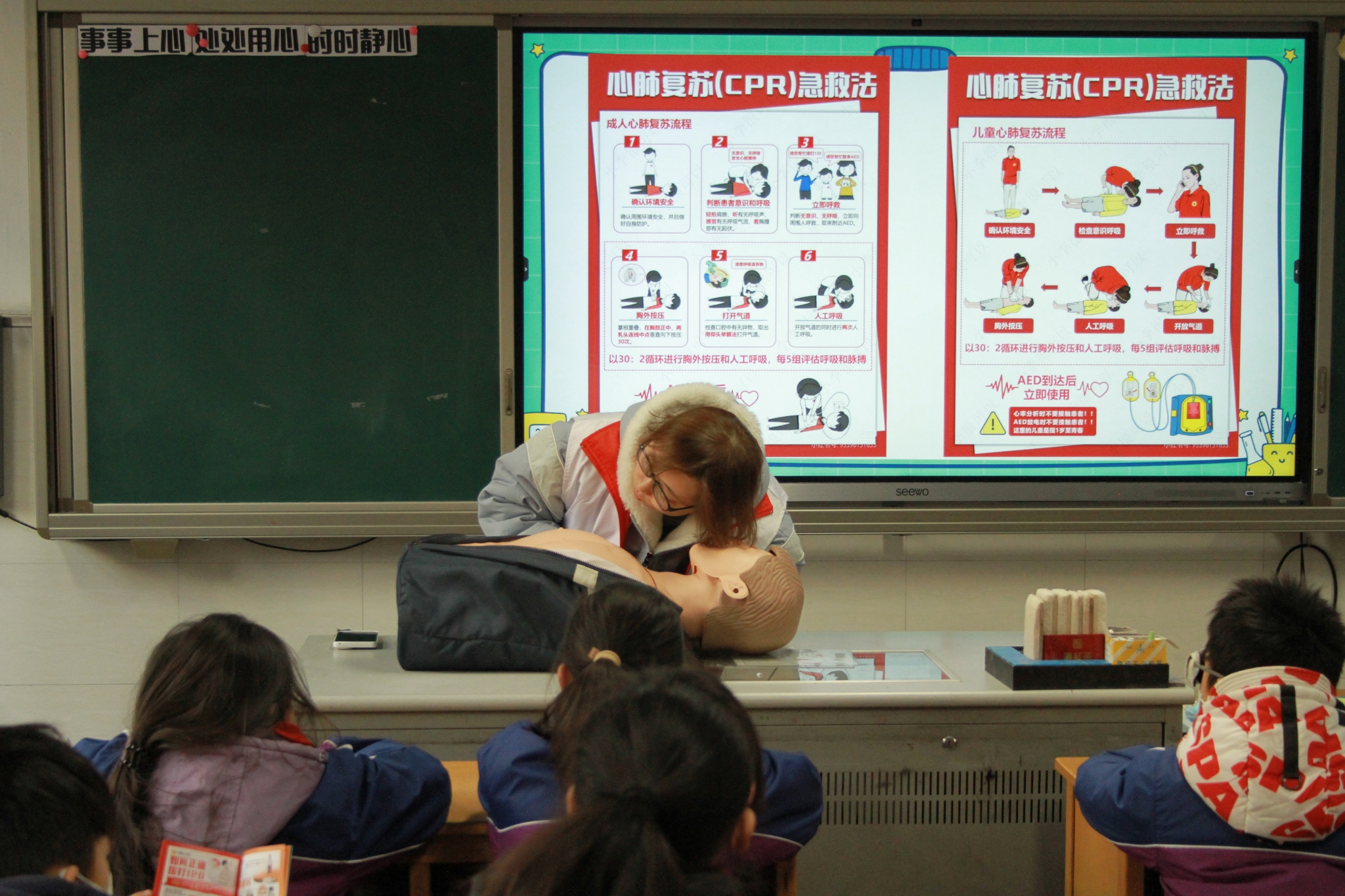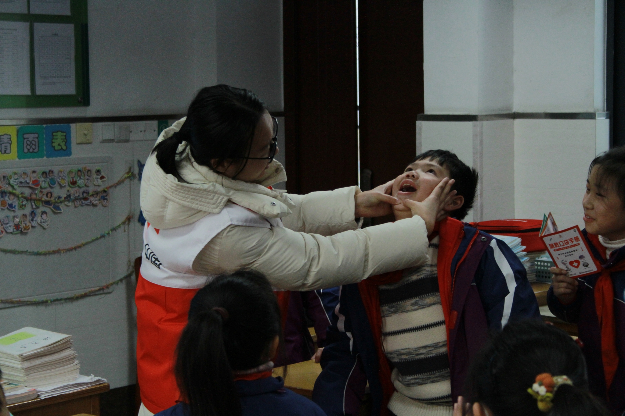 急救知识公益宣讲中,志愿服务队成员孟庆钰结合小朋友日常易遇的意外场景,用通俗易懂的语言讲解了流鼻血、割伤、烫伤等常见伤害的正确处理方法,手把手引导孩子们掌握基础自救技巧,让孩子们学会在突发状况下保护自己。徐嘉佳则聚焦应急救援关键技能,通过现场示范、互动教学、一对一指导的方式,演示了海姆立克急救法的操作要领、心肺复苏与人工呼吸的配合技巧,以及AED设备的使用流程,将专业的急救知识转化为孩子们能理解、会运用的实用技能,为孩子们的健康成长筑牢安全防线。