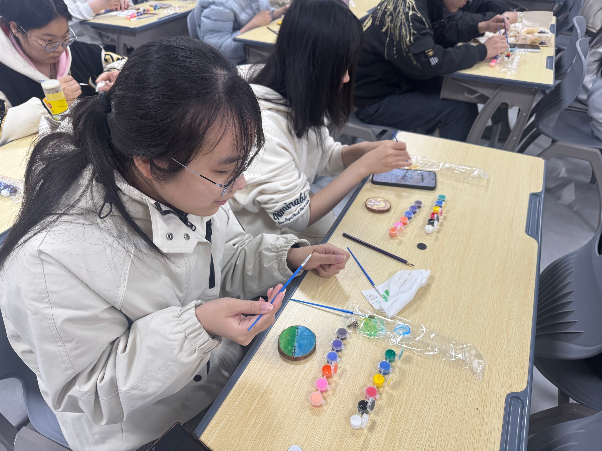 在木画创作课堂上,指导老师讲解了木画创作的基本技法和艺术疗愈原理,引导学生“以木为纸、以画寄情”。课堂创新性地将传统木艺与表达性艺术治疗相结合,让学生在动手实践中锻炼专注力与创造力,更在非言语的艺术表达中梳理情绪、认知自我,达成了“以劳育心、以心促劳”的心理育人成效。
