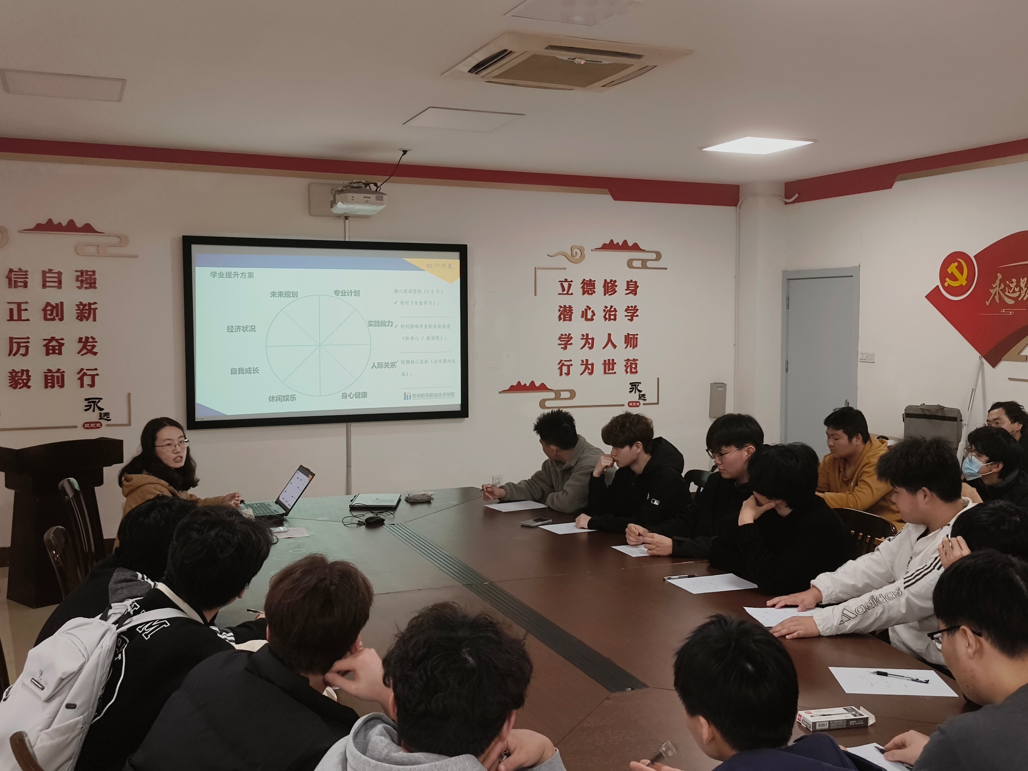 在实践互动环节中,辅导员陶宇佳引导学生围绕专业学习、身心规划等维度绘制学业生涯规划平衡轮,分析自身不足与改进方向,并制定本学期短期学习目标。